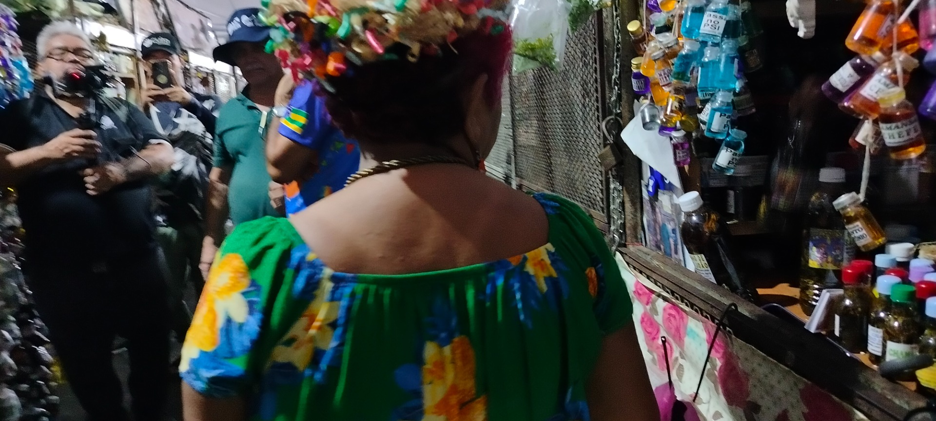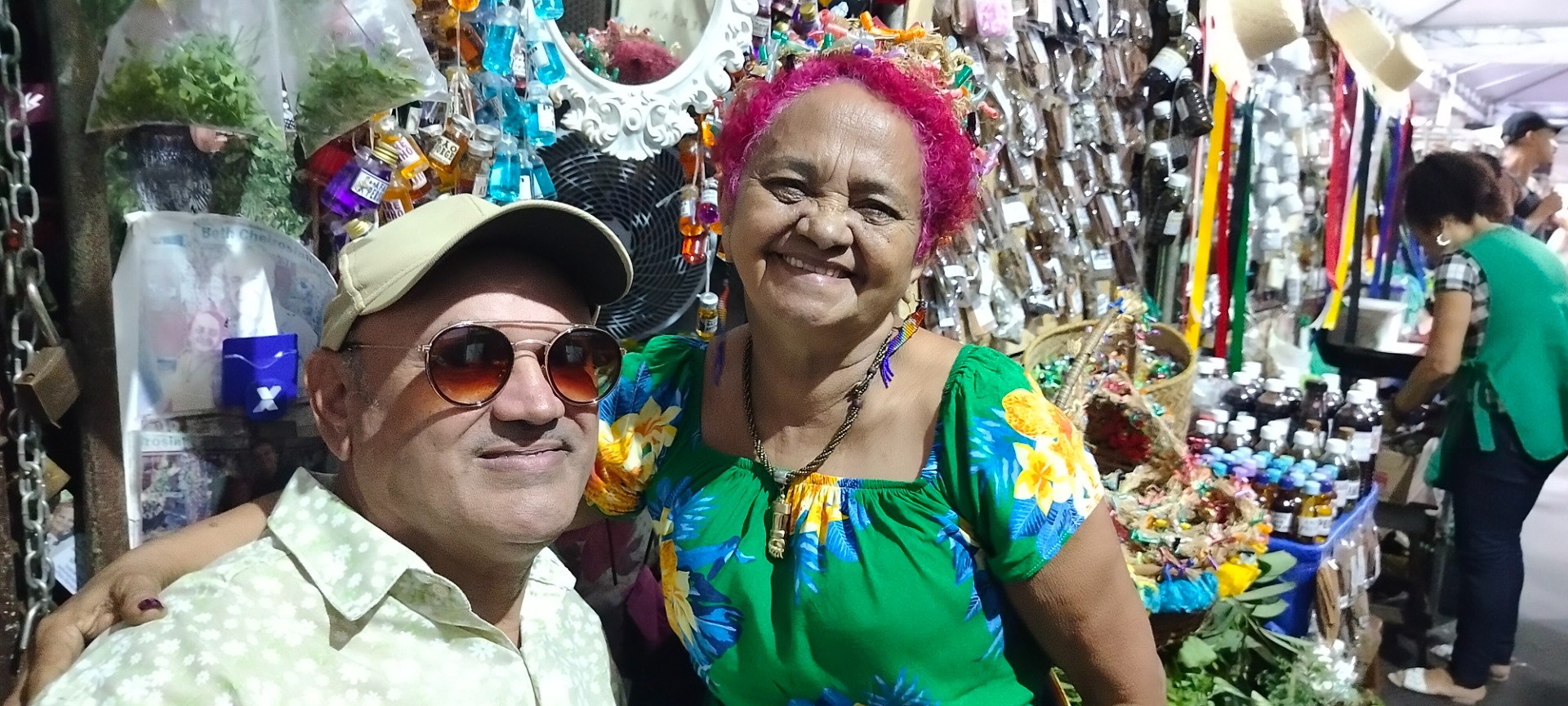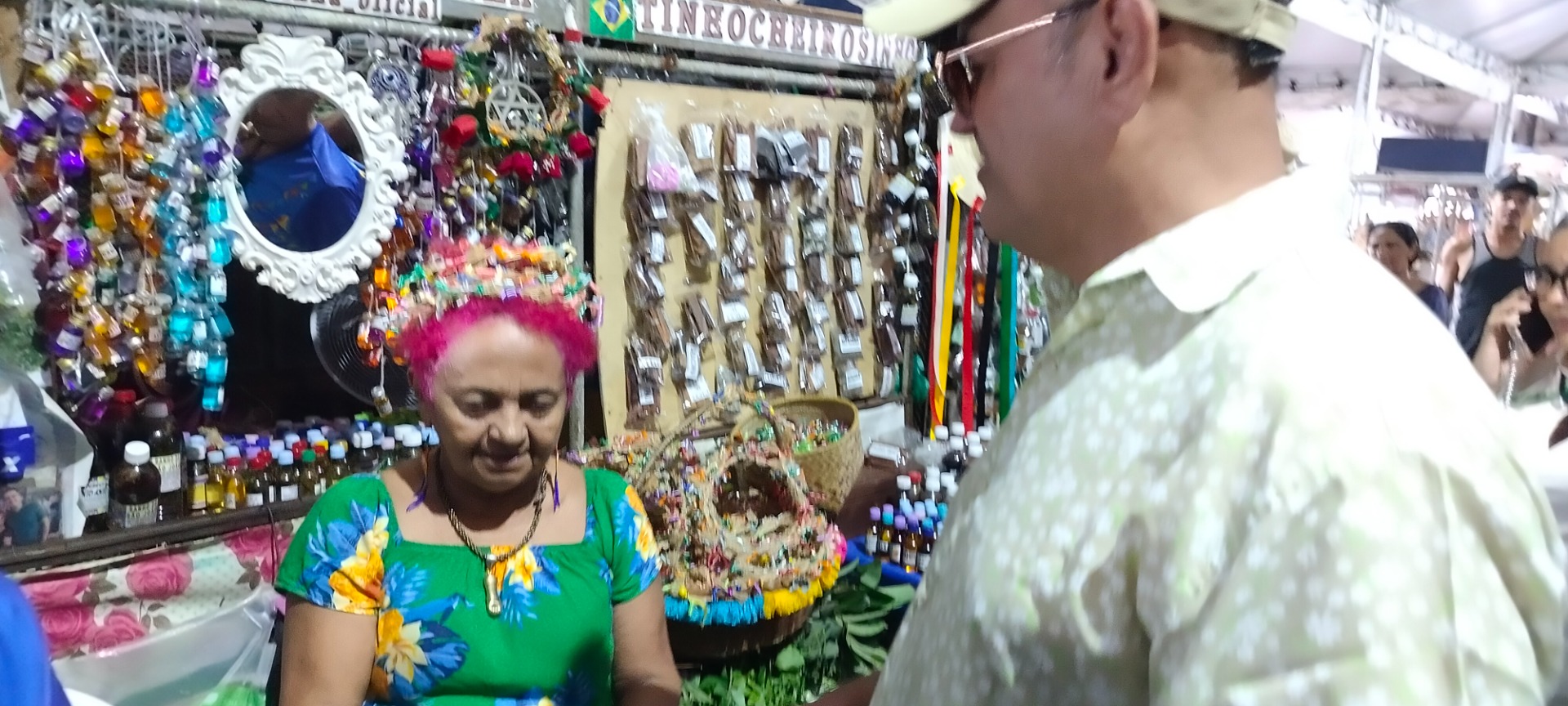 Entre tantas cenas marcantes nos corredores do Ver-o-Peso, uma chamou atenção pela força simbólica e espiritual: o jornalista Hélio Costa, da Paraíba, recebeu das mãos da lendária Beth Xeirozinha não apenas um banho de ervas, mas uma bênção ancestral. Com suas rezas sussurradas entre folhas verdes e cheiros intensos, Beth — patrimônio vivo do mercado — compartilhou seu saber com respeito e ternura, como quem rega uma planta rara.